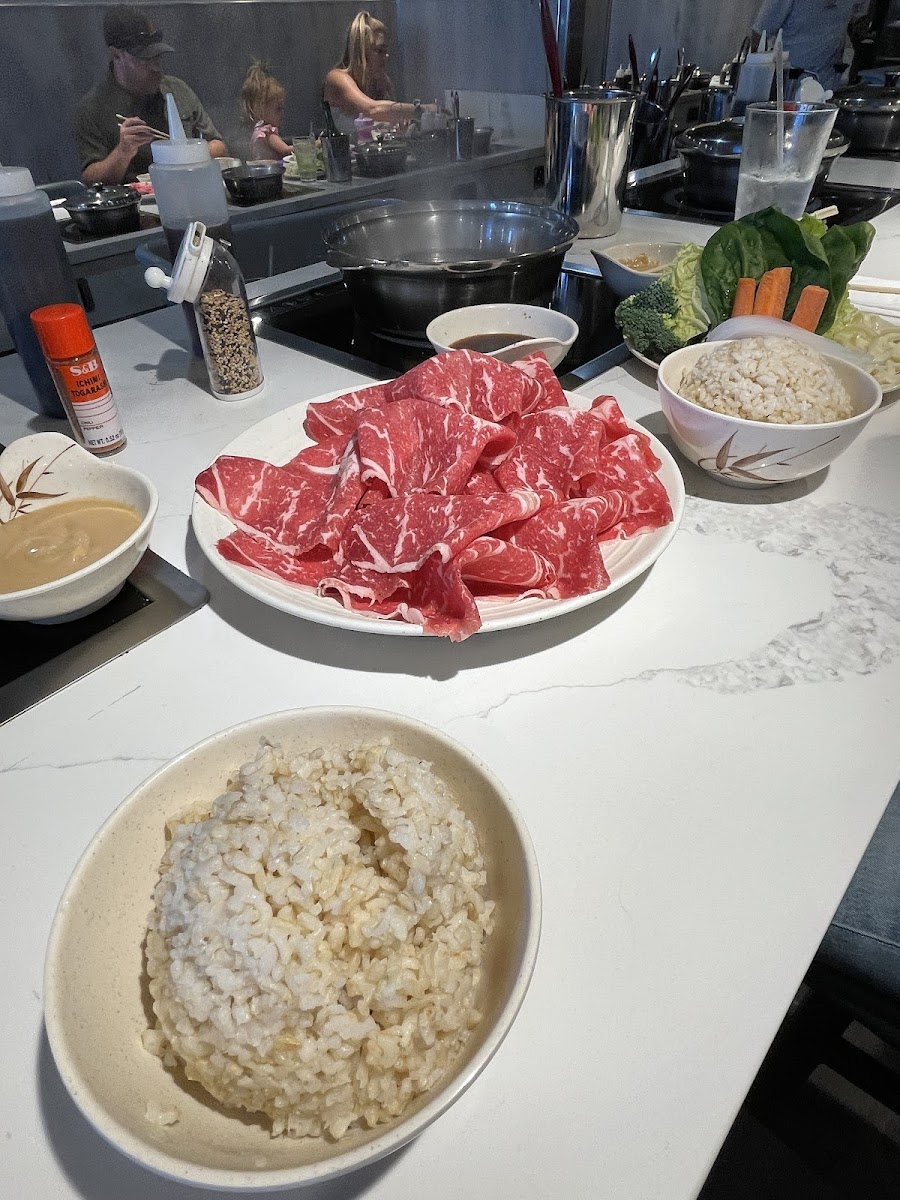 California Shabu Shabu specializes in the traditional Japanese hot pot, where guests can enjoy a custom experience, cooking their own ingredients right at the table. The restaurant’s hot pot is a fan favorite, featuring a variety of fresh ingredients that include tender, choice beef rib eye, mouthwatering salmon sashimi, and a selection of fresh vegetables. You’ll also find a side of white rice that complements the rich, savory broth.