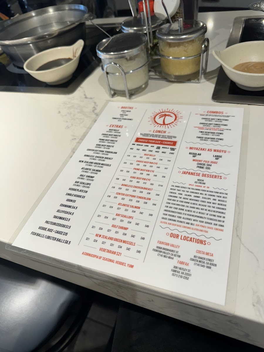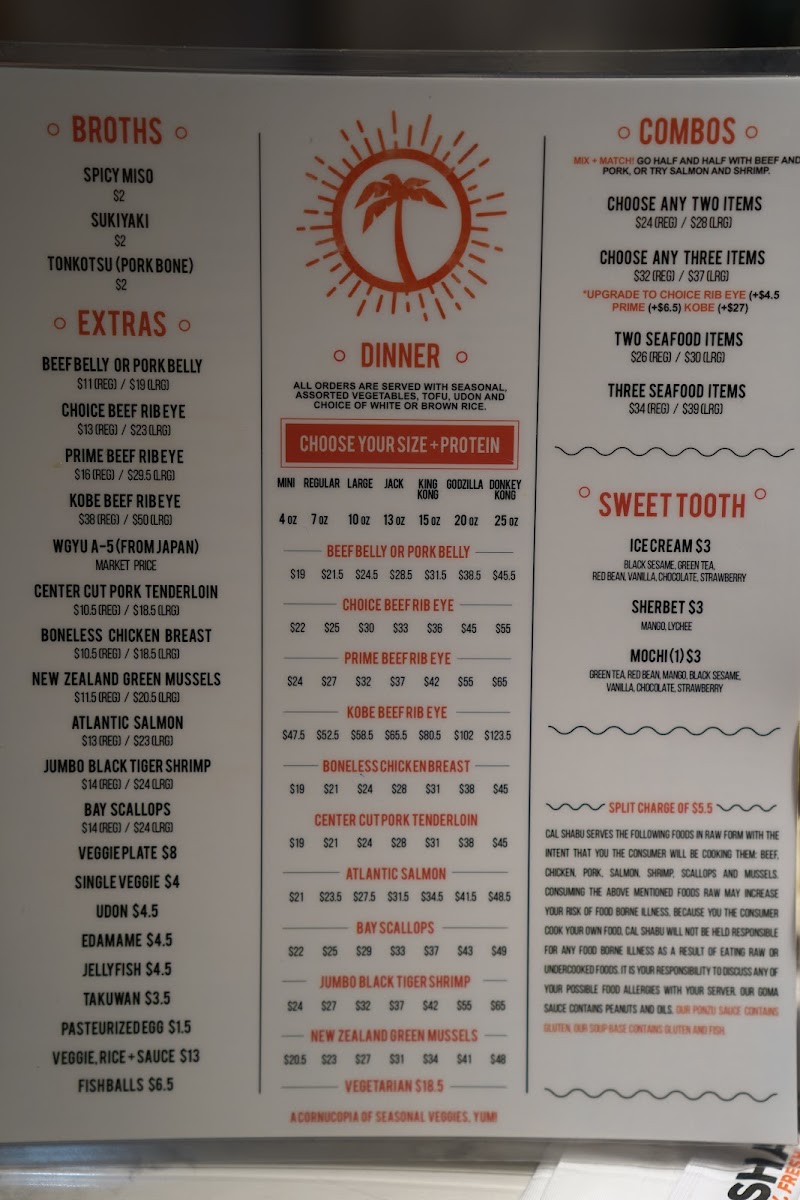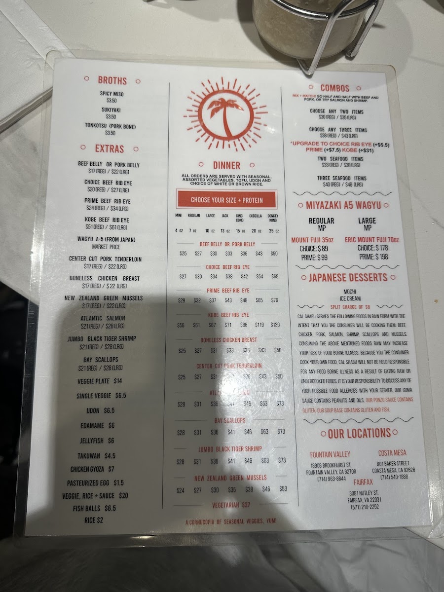 California Shabu Shabu offers a delightful range of menu options, perfect for any diner craving fresh, flavorful ingredients paired with traditional Japanese hot pot. Their drink selection includes refreshing beverages such as Iced Green Tea, Iced Oolong, Iced Tea, and the unique Ramune Fizzy Soda, alongside classic options like Apple and Orange Juice. Beer enthusiasts can enjoy popular choices like Sapporo, Kirinichiban, AsahiOrion, and Kirin Light, while sake lovers can opt for House Cold + Hot Sake, Draft, or premium varieties like Hana Nigori and Sayuri Nigori. The extras section offers premium meat options such as Beef Belly, Choice Beef Ribeye, Prime Beef Ribeye, and Kobe Beef Ribeye, alongside tender cuts like Center Cut Pork Tenderloin. For those with a sweet tooth, desserts like Mochi Ice Cream and refreshing Ice Cream or Sherbet are available to end the meal on a high note. Additionally, the menu includes flavorful broths like Spicy Miso and Sukiyaki, perfect for dipping the tender meats. Whether you're craving savory hot pot or a light refreshing drink, California Shabu Shabu's menu provides a well-rounded dining experience for any palate.